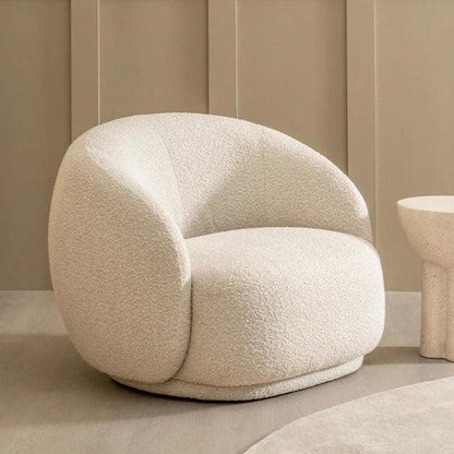 The Cloud Bouclé Armchair, upholstered in elegant white bouclé fabric, features a gracefully curved backrest and a plush foam-padded cushion for ultimate comfort. Perfect as a statement piece, this luxurious accent chair adds